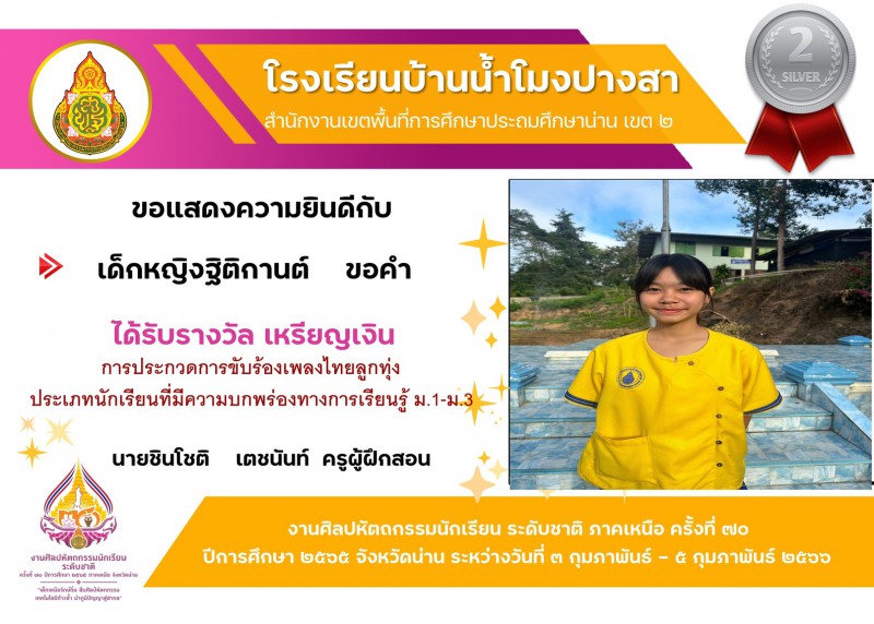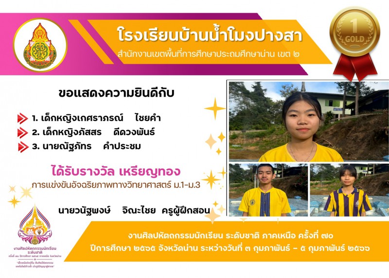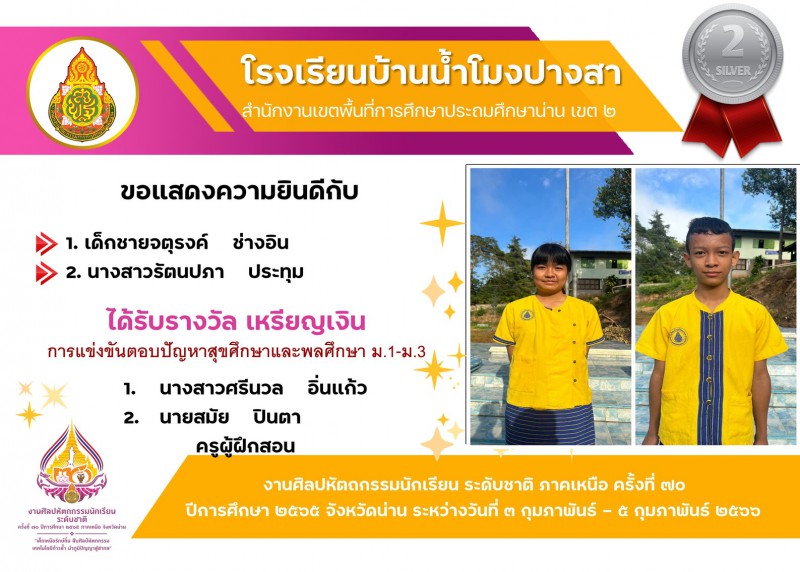 โรงเรียนบ้านน้ำโมงปางสา ขอแสดงความยินดีกับนักเรียนที่ได้รับรางวัลจากการแข่งขันงานศิลปหัตถกรรมนักเรียน ระดับชาติ ภาคเหนือ ครั้งที่ 70